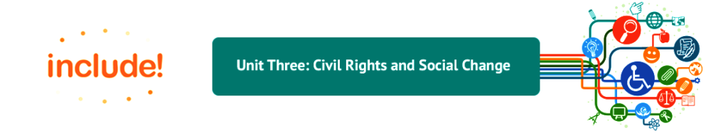 Unit 3, Civil Rights and Social Change, provides language arts, civics and history, and math lessons that explore disability as a social justice and civil rights issue, both in the United States and around the world. It reminds us that disability has been part of our shared social history and a growing part of global human rights concerns.